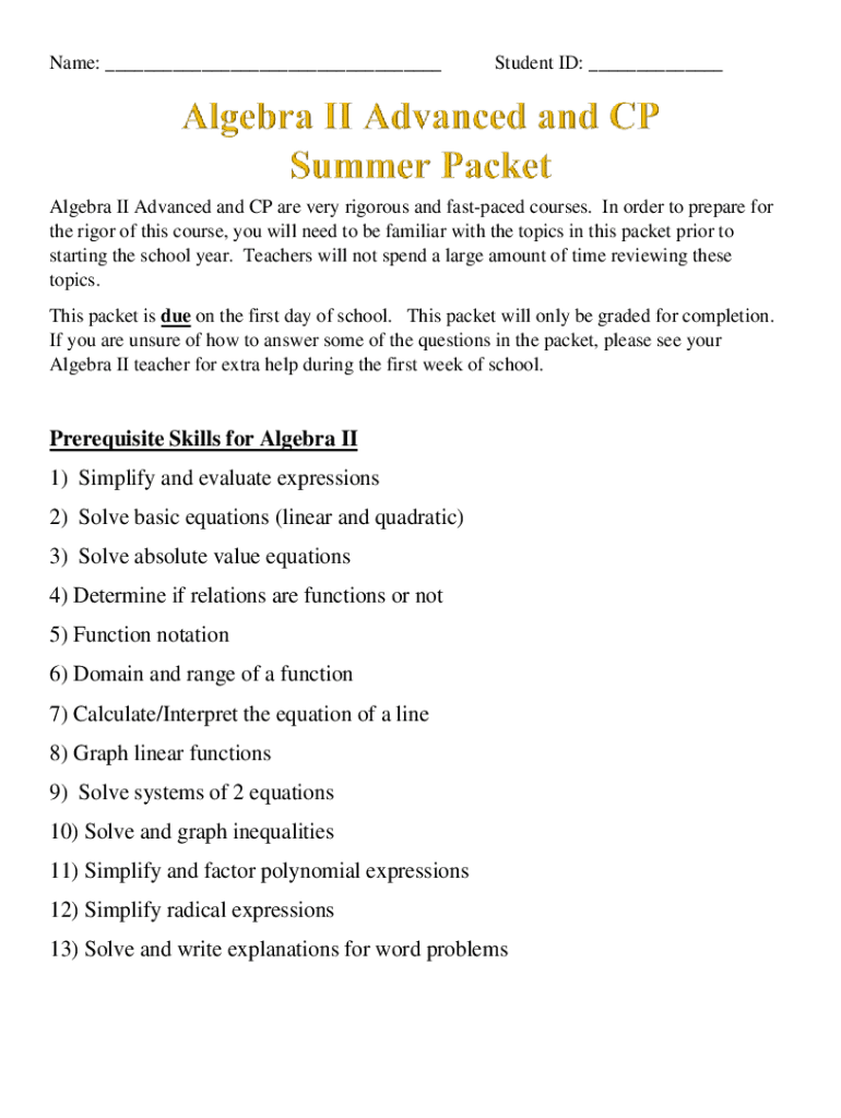 Name: ___Student ID: ___Algebra II Advanced and CP are very rigorous and fast-paced courses. In order to prepare for the rigor of this course, you will need to be familiar with the topics in this