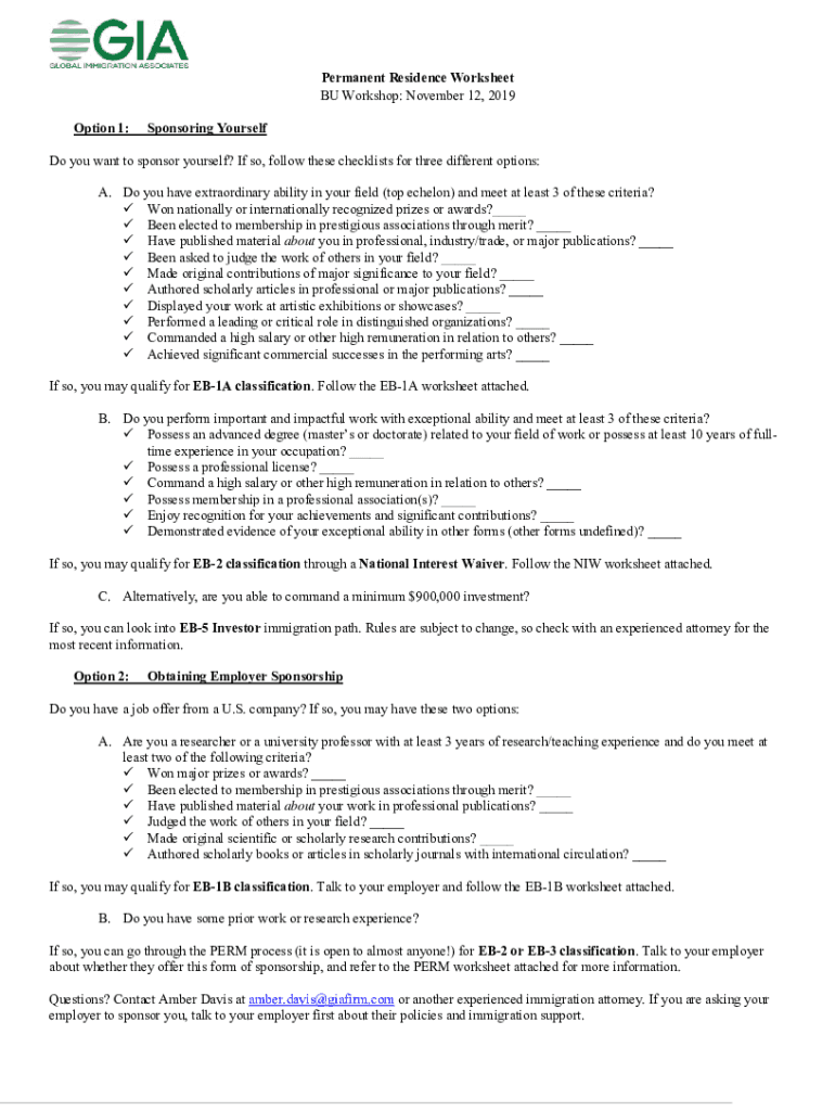 Option 1:Permanent Residence Worksheet BU Workshop: November 12, 2019Sponsoring Yourself you want to sponsor yourself? If so, follow these checklists for three different options: A. Do you have extraordinary