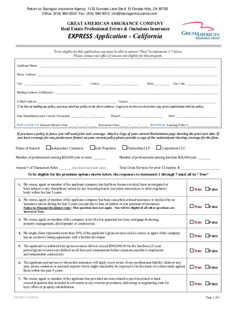 Return to: Barrage Insurance Agency 1132 Sun cast Lane Ste 8 El Dorado Hills, CA 95762 Office: (916) 9849320 Fax: (916) 9848013 Info@barraganinsurance.comGREAT AMERICAN ASSURANCE COMPANY Real Estate
