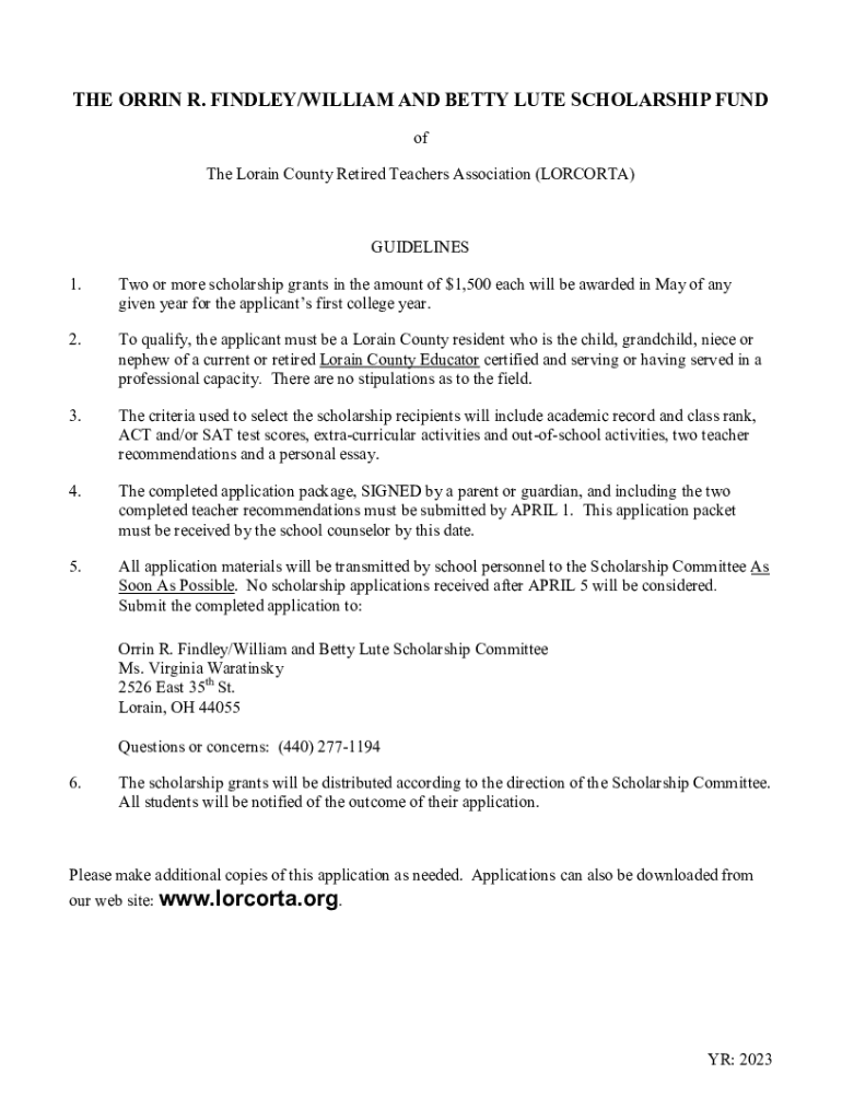 THE ORIN R. FINLEY/WILLIAM AND BETTY LUTE SCHOLARSHIP FUND of The Lorain County Retired Teachers Association (LORETTA)GUIDELINES 1. Two or more scholarship grants in the amount of $1,500 each will