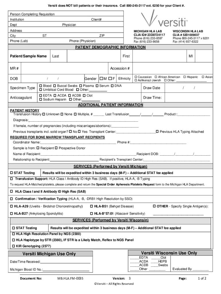 Version does NOT bill patients or their insurance. Call 8002453117 ext. 6250 for your Client #. Person Completing Requisition InstitutionClient#DeptPhysicianAddressMICHIGAN HLA LABCitySTCLIA ID# 23D0724117ZIPPhone
