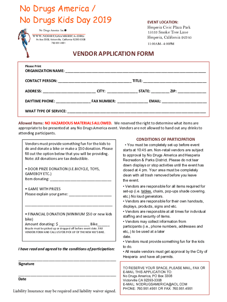 No Drugs America / No Drugs Kids Day 2019 No Drugs America Inc. www.nodrugsamerica.org Po Box 3308, Victorville, California 923933308EVENT LOCATION: Hesperia Civic Plaza Park 15833 Smoke Tree Lane