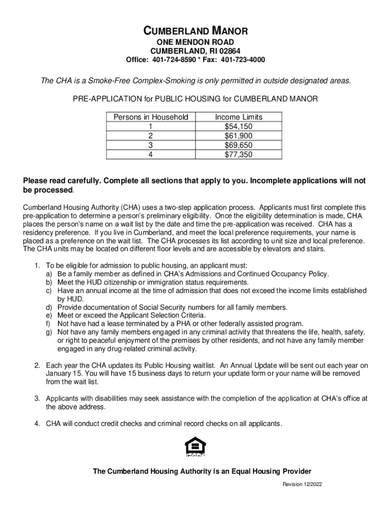 CUMBERLAND MANOR ONE TENDON ROAD CUMBERLAND, RI 02864 Office: 4017248590 * Fax: 4017234000The CIA is a Smoke-free ComplexSmoking is only permitted in outside designated areas. REAPPLICATION for PUBLIC