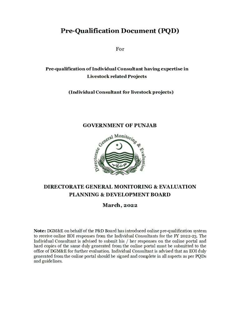 PreQualification Document (PhD) Prequalification of Individual Consultant having expertise in Livestock related Projects (Individual Consultant for livestock projects)GOVERNMENT OF PUNJABDIRECTORATE