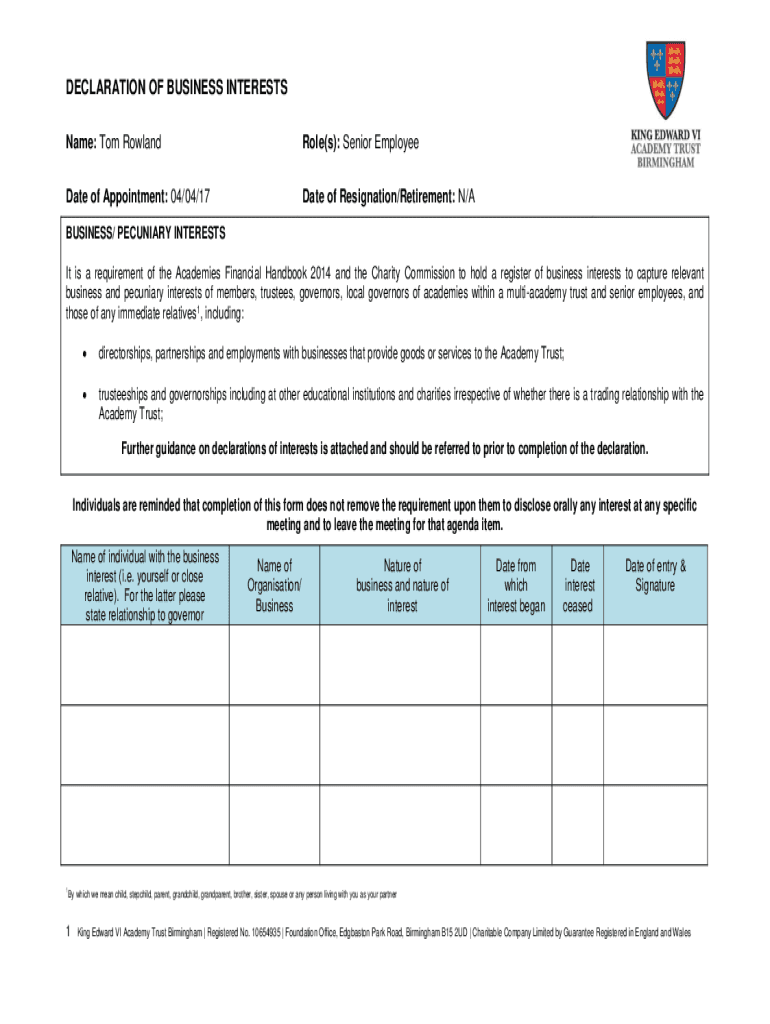 DECLARATION OF BUSINESS INTERESTS Name: Tom Rowlandson(s): Senior EmployeeDate of Appointment: 04/04/17Date of Resignation/Retirement: N/BUSINESS/ PECUNIARY INTERESTS It is a requirement of the Academies
