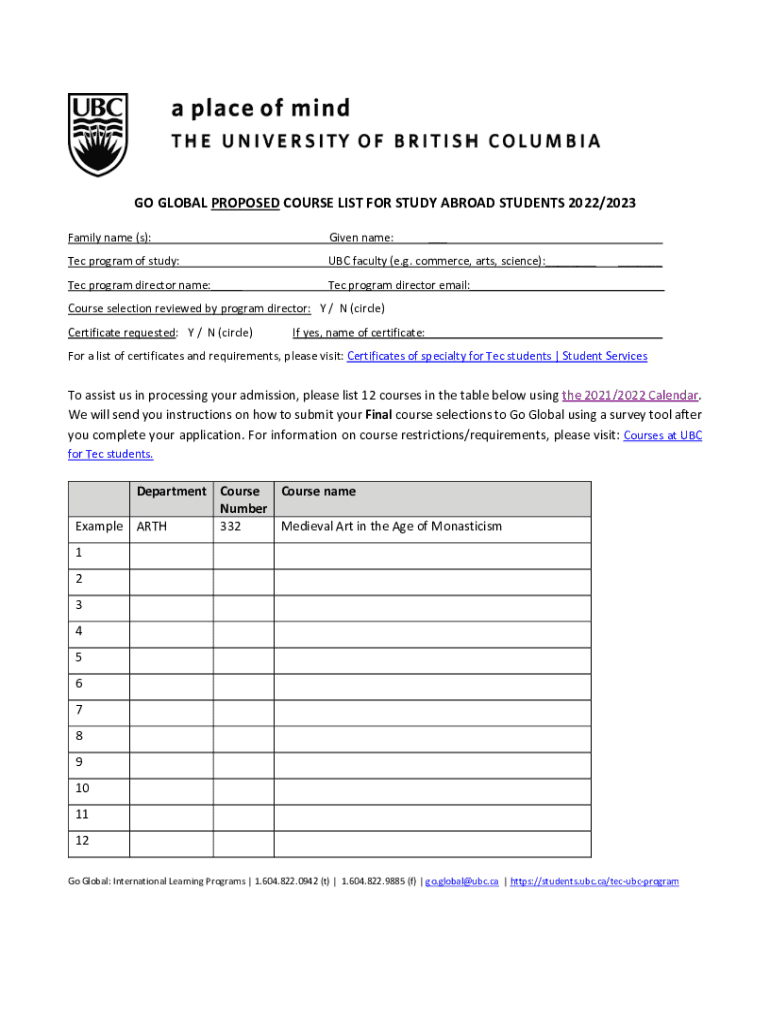 GO GLOBAL PROPOSED COURSE LIST FOR STUDY ABROAD STUDENTS 2022/2023 Family name (s):Given name:___. TEC program of study:UBC faculty (e.g. commerce, arts, science):___TEC program director name:___TEC