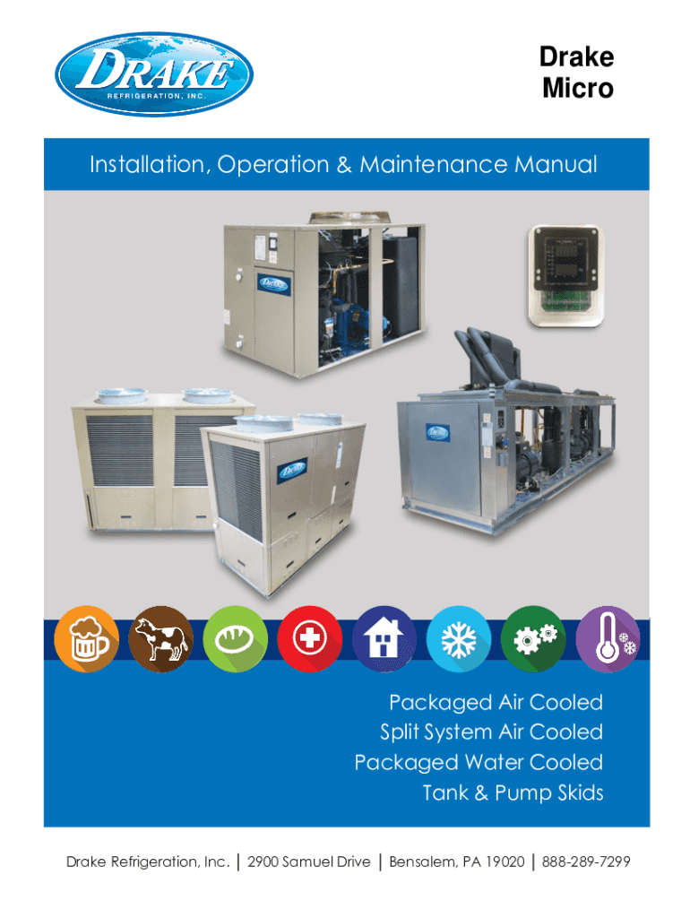 Drake Micro Installation, Operation & Maintenance ManualPackaged Air Cooled Split System Air Cooled Packaged Water Cooled Tank & Pump Skids Drake Refrigeration, Inc. 2900 Samuel Drive Bensalem, PA