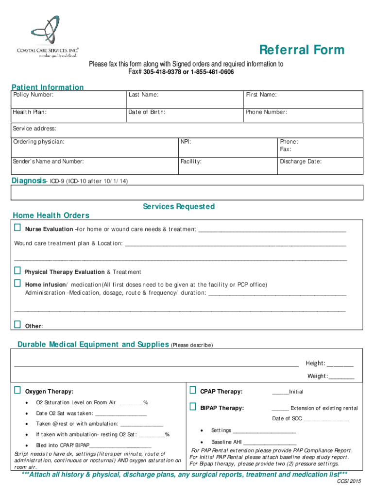 Referral Formulas fax this form along with Signed orders and required information to Fax# 3054189378 or 18554810606Patient Information Policy Number:Last Name:First Name:Health Plan:Date of Birth:Phone