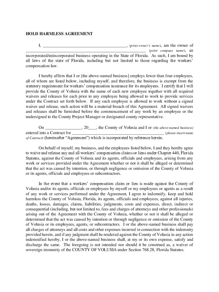 HOLD HARMLESS AGREEMENT I, ___, (print owners name), am the owner of ___ (print company name), an incorporated/unincorporated business operating in the State of Florida. As such, I am bound by all
