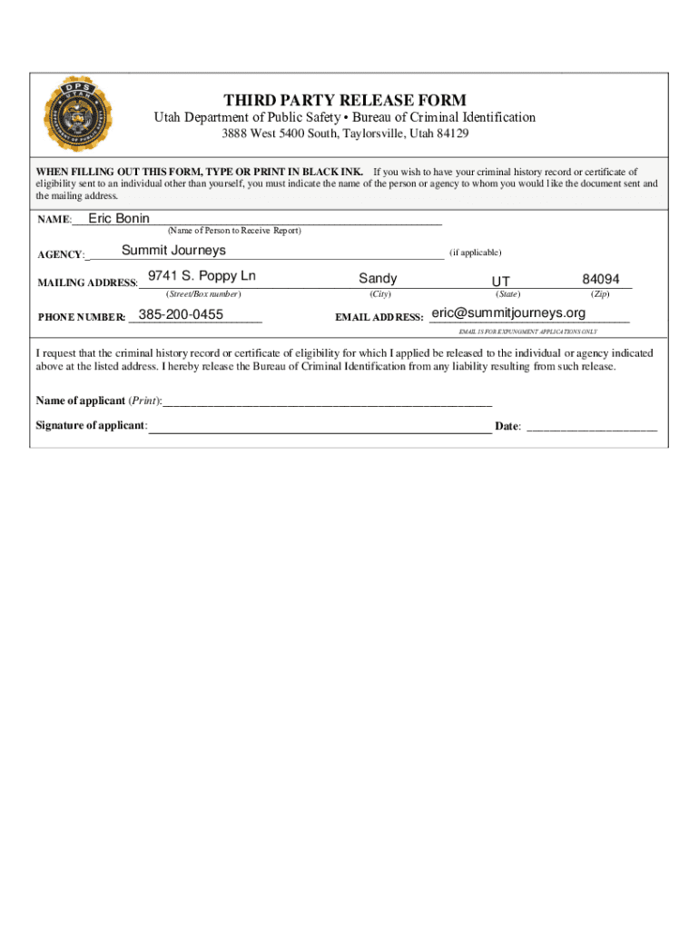 THIRD PARTY RELEASE FORM Utah Department of Public Safety Bureau of Criminal Identification 3888 West 5400 South, Taylorsville, Utah 84129 WHEN FILLING OUT THIS FORM, TYPE OR PRINT IN BLACK INK. If