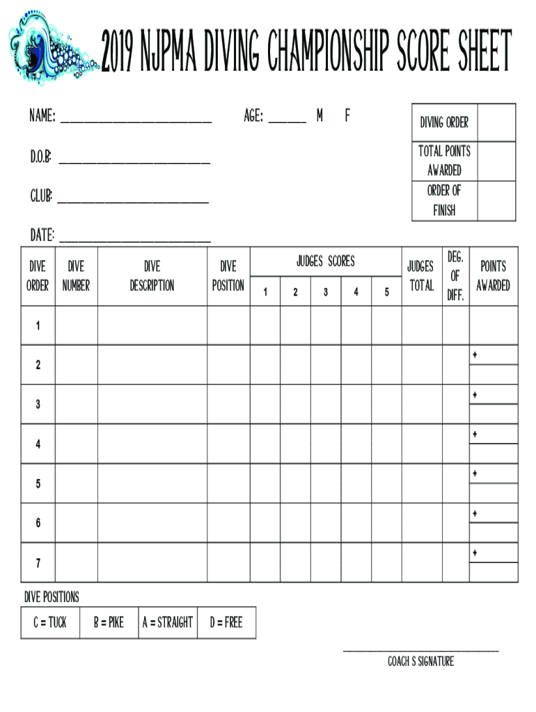 The njpma diving championship score can be filled out by recording the judges' scores for each dive and calculating the total score.