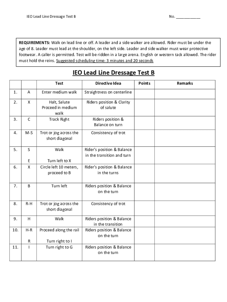 IEC Lead Line Dressage Test BNO. ___REQUIREMENTS: Walk on lead line or off. A leader and a side walker are allowed. Rider must be under the