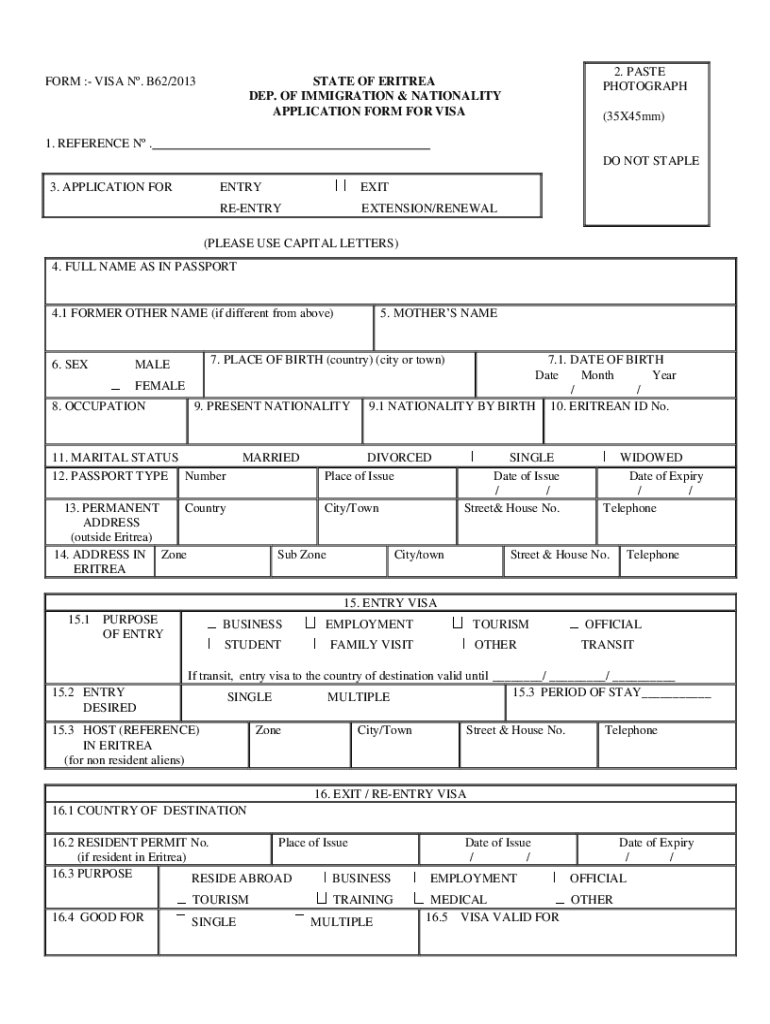 FORM : VISA N. B62/20132. PASTE PHOTOGRAPHSTATE OF ERITREA DEP. OF IMMIGRATION & NATIONALITY APPLICATION FORM FOR VISA(35×45 mm)1. REFERENCE N. DO NOT STAPLE 3. APPLICATION FORENTRYEXITREENTRYEXTENSION/RENEWAL(PLEASE