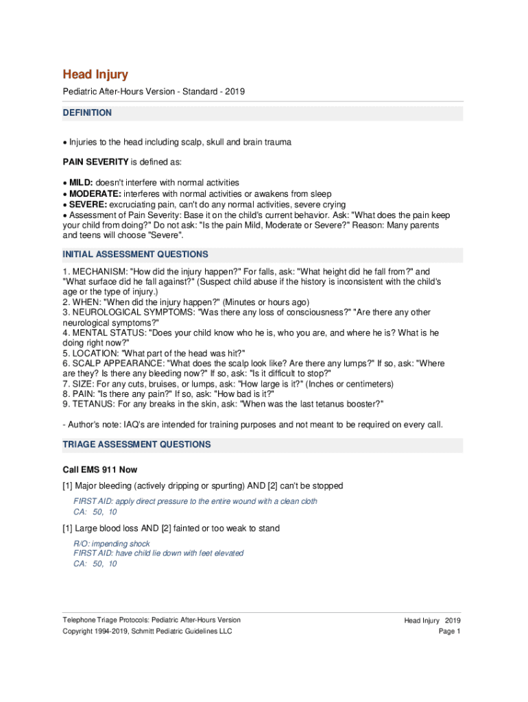 Head Injury Pediatric Afternoons Version Standard 2019 DEFINITIONInjuries to the head including scalp, skull and brain trauma PAIN SEVERITY is defined as: MILD: doesn't\'t interfere with normal activities