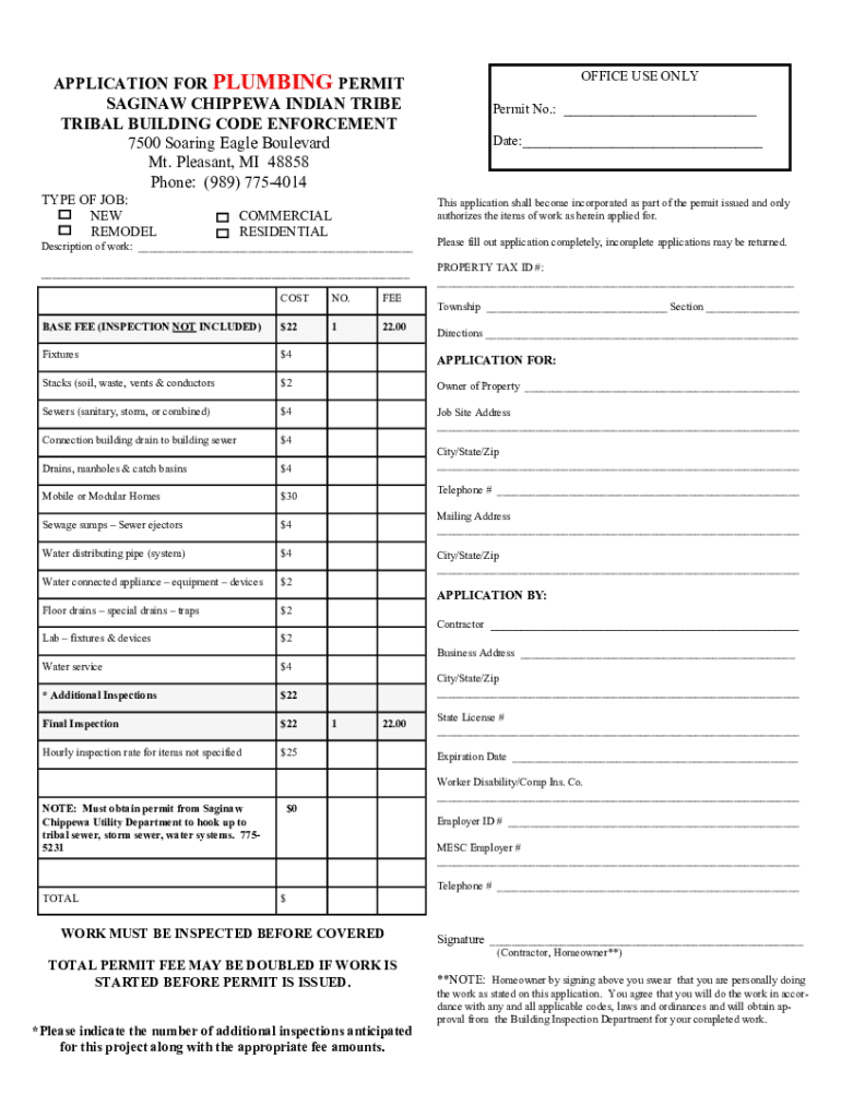 APPLICATION FOR PLUMBING PERMIT SAGINAW CHIPPEWA INDIAN TRIBE TRIBAL BUILDING CODE ENFORCEMENT 7500 Soaring Eagle Boulevard Mt. Pleasant, MI 48858 Phone: (989) 7754014 TYPE OF JOB: NEW REMODELOFFICE