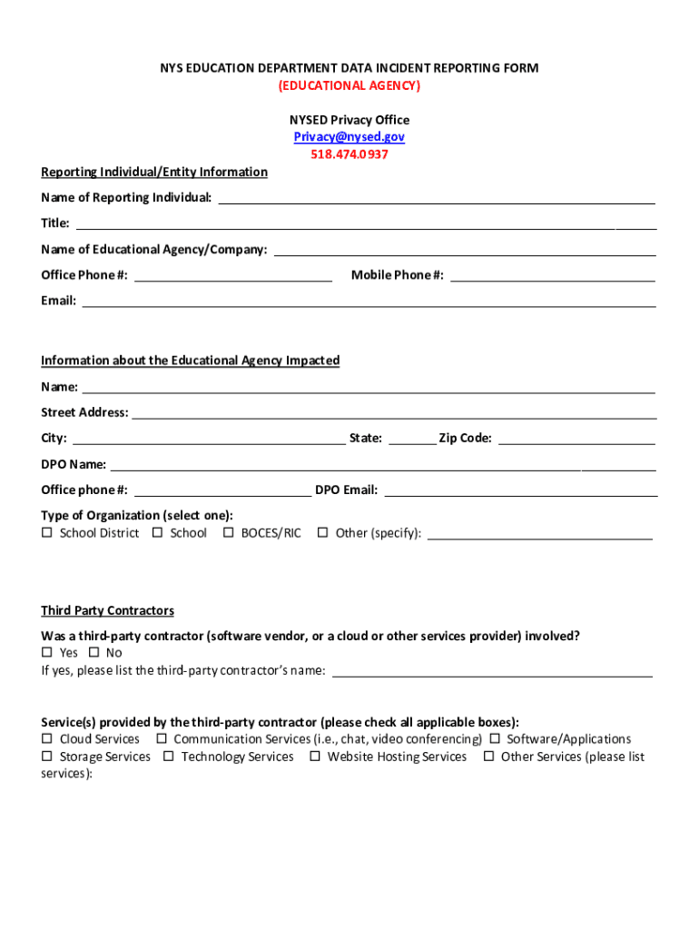 NYS EDUCATION DEPARTMENT DATA INCIDENT REPORTING FORM (EDUCATIONAL AGENCY)Reporting Individual/Entity InformationNYSED Privacy Office Privacy@nysed.gov 518.474.0937Name of Reporting Individual: ___