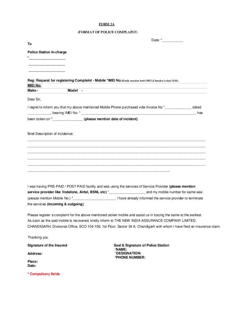 FORM 2A (FORMAT OF POLICE COMPLAINT) Date: *___ To Police Station In charge *___ ___ ___ Reg: Request for registering Complaint Mobile *IMEI No (Kindly mention both IMEI if handset is dual SIM). IMEI