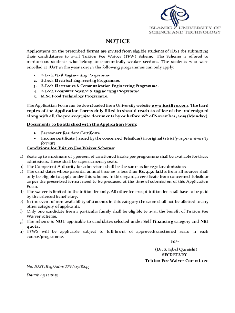NOTICE Applications on the prescribed format are invited from eligible students of MUST for submitting their candidatures to avail Tuition Fee Waiver (TOW) Scheme. The Scheme is offered to meritorious