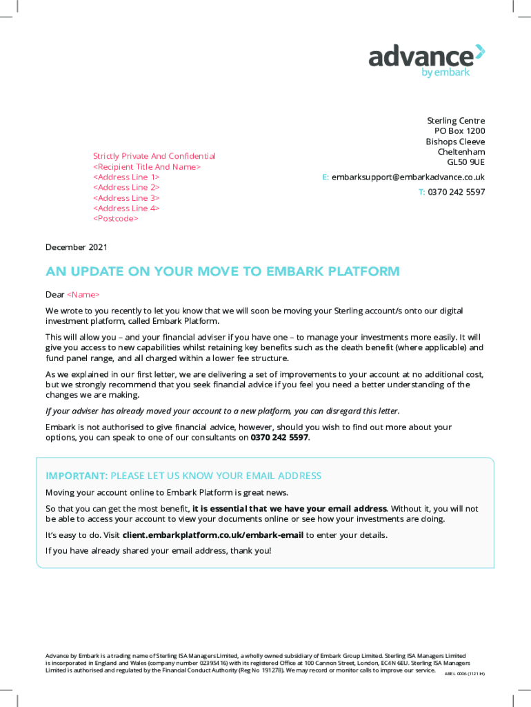 Strictly Private And Confidential Recipient Title And Name Address Line 1 Address Line 2 Address Line 3 Address Line 4 Postcode Sterling Center PO Box 1200 Bishops Sleeve Cheltenham GL50 9UE E: embarksupport@embarkadvance.co.uk