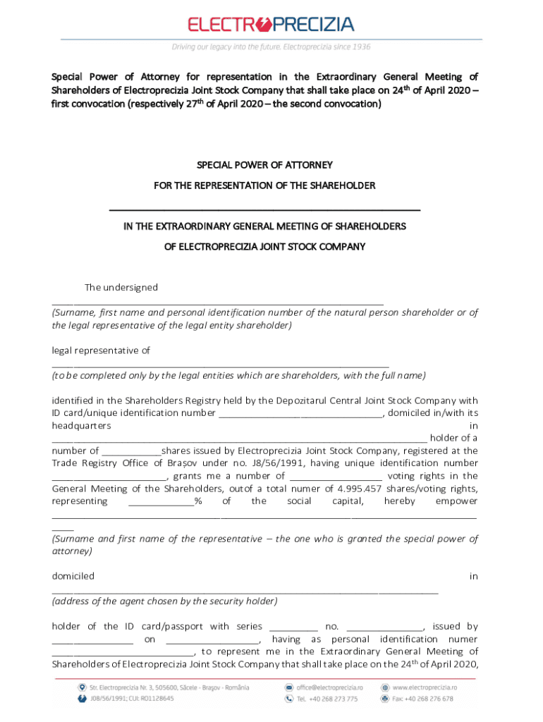 Special Power of Attorney for representation in the Extraordinary General Meeting of Shareholders of Electroprecizia Joint Stock Company that shall take place on 24th of April 2020 first convocation