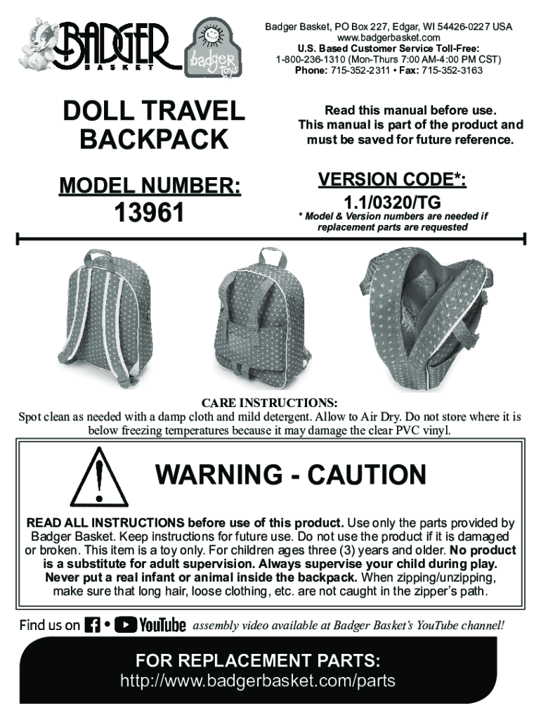 Badger Basket, PO Box 227, Edgar, WI 544260227 USA www.badgerbasket.com U.S. Based Customer Service Toll-free: 18002361310 (Mon Thurs 7:00 AM4:00 PM CST) Phone: 7153522311 Fax: 7153523163DOLL TRAVEL
