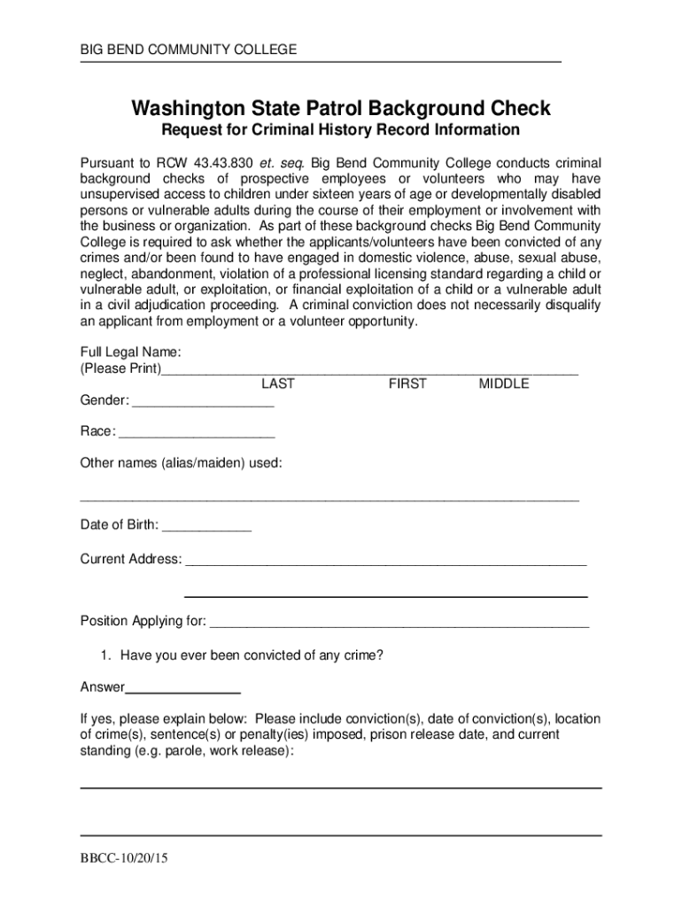 BIG BEND COMMUNITY COLLEGE Washington State Patrol Background Check Request for Criminal History Record Information Pursuant to RCW 43.43.830 ET. seq. Big Bend Community College conducts criminal