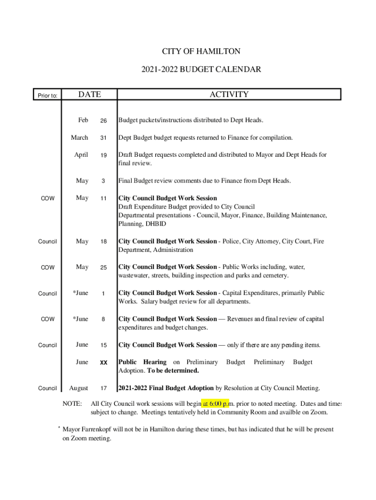 CITY OF HAMILTON 20212022 BUDGET CALENDAR Interior to:ACTIVITYFeb26Budget packets/instructions distributed to Dept Heads. March31Dept Budget requests returned to Finance for compilation. April19Draft