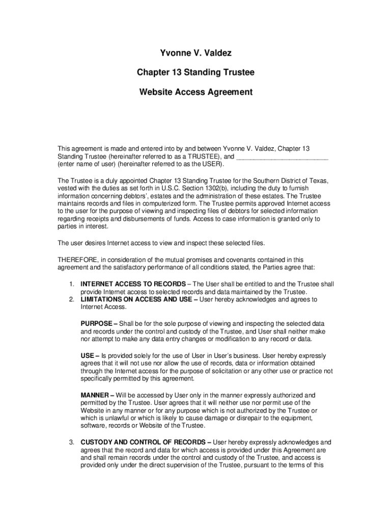 Yvonne V. Valdez Chapter 13 Standing Trustee Website Access Agreements agreement is made and entered into by and between Yvonne V. Valdez, Chapter 13 Standing Trustee (hereinafter referred to as a