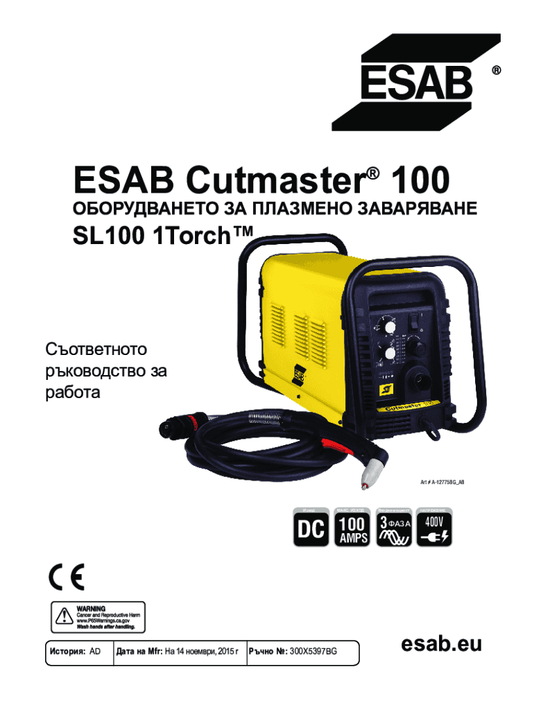 ESA Cut master 100 SL100 1Torch Art # A12775BG_AB. 100400VAMPS: AD Mfr: 14, 2015 r : 300×5397BGesab.EU ! ESA