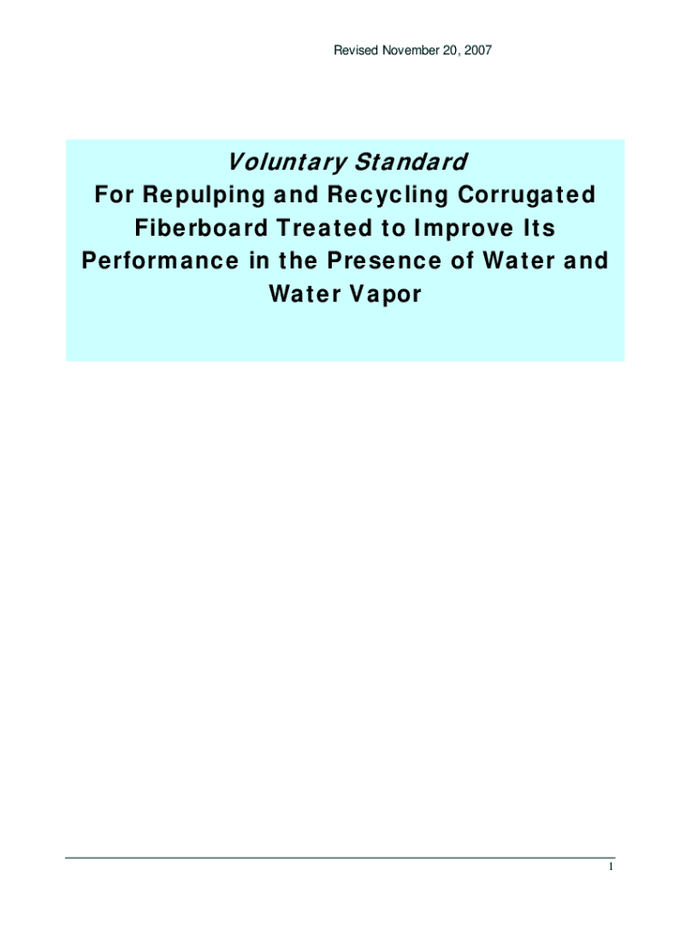 Revised November 20, 2007Voluntary Standard Repulsing and Recycling Corrugated Fiberboard Treated to Improve Its Performance in the Presence of Water and Water Vapor1TABLE OF CONTENTS Introduction