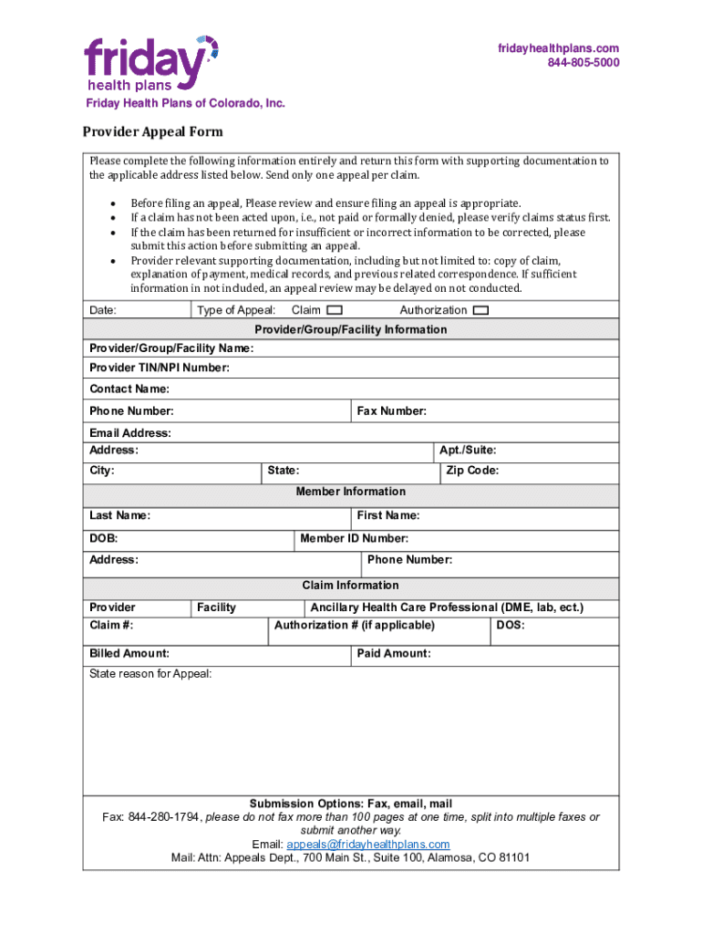 Fridayhealthplans.com 8448055000Friday Health Plans of Colorado, Inc. Provider Appeal Form Please complete the following information entirely and return this form with supporting documentation to