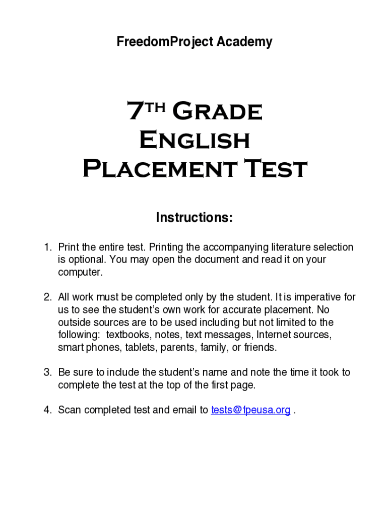 FreedomProject Academy7th Grade English Placement Test Instructions: 1. Print the entire test. Printing the accompanying literature selection is optional. You may open the document and read it on