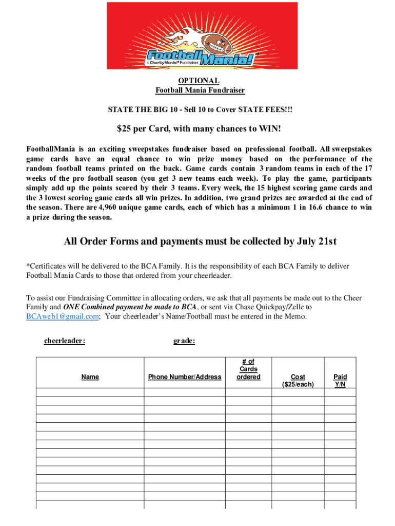 OPTIONAL Football Mania Fundraiser STATE THE BIG 10 Sell 10 to Cover STATE FEES!!!$25 per Card, with many chances to WIN! FootballMania is an exciting sweepstakes fundraiser based on professional