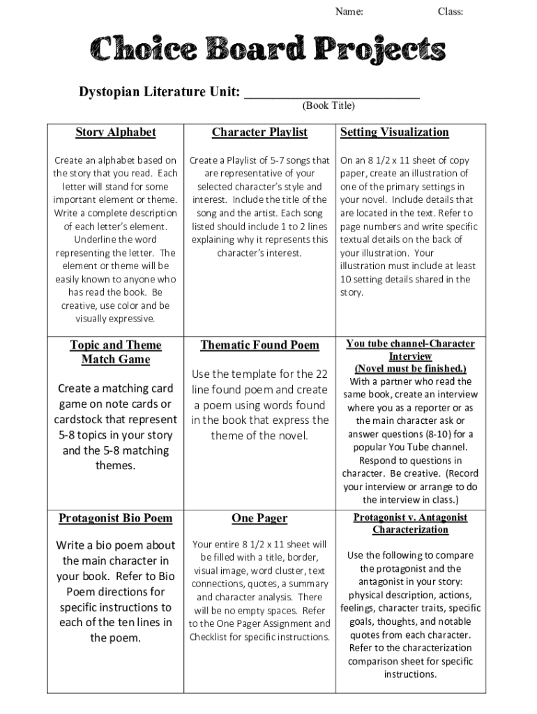 Name:Class:Choice Board Projects Dystopian Literature Unit: ___ (Book Title)Story AlphabetCharacter PlaylistCreate an alphabet based on the story that you read. Each letter will stand for some important
