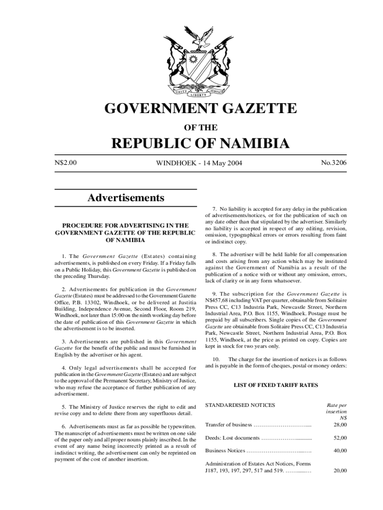 GOVERNMENT GAZETTE OF REPUBLIC OF NAMIBIA N$2.00WINDHOEK 14 May 2004No.3206Advertisements PROCEDURE FOR ADVERTISING IN THE GOVERNMENT GAZETTE OF THE REPUBLIC OF NAMIBIA 1. The Government Gazette (Estates)