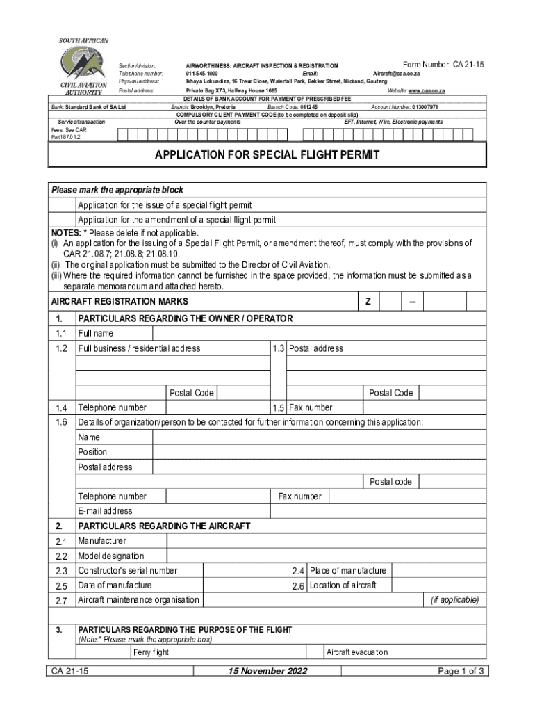 Form AIRWORTHINESS: AIRCRAFT INSPECTION & REGISTRATION 0115451000 Email: Aircraft@caa.co.za Ithaca Lokundiza, 16 Truer Close, Waterfall Park, Becker Street, Midland, GautengSection/division: Telephone