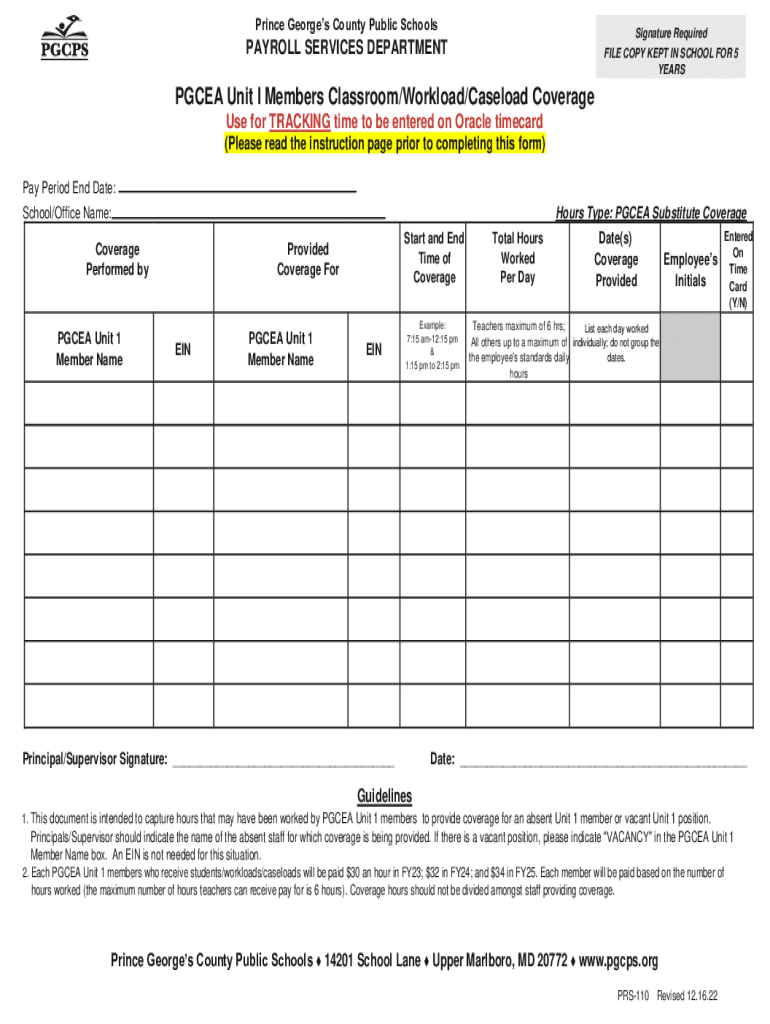 Prince Georges County Public SchoolsSignature Required FILE COPY KEPT IN SCHOOL FOR 5 YEARSPAYROLL SERVICES DEPARTMENTPGCEA Unit I Members Classroom/Workload/Caseload Coverage Use for TRACKING time