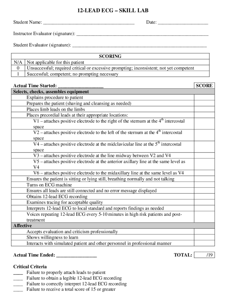 12LEAD ECG SKILL LAB Student Name: ___Date: ___Instructor Evaluator (signature): ___ Student Evaluator (signature): ___ SCORING N/A Not applicable for this patient 0 Unsuccessful; required critical