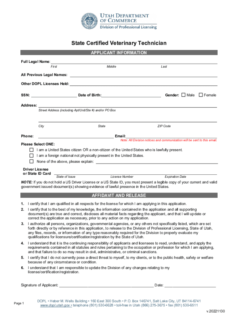 State Certified Veterinary Technician APPLICANT INFORMATION Full Legal Name: FirstMiddleLastAll Previous Legal Names: Other DOLL Licenses Held: SSN:Date of Birth:Gender:MaleFemaleAddress: Street Address