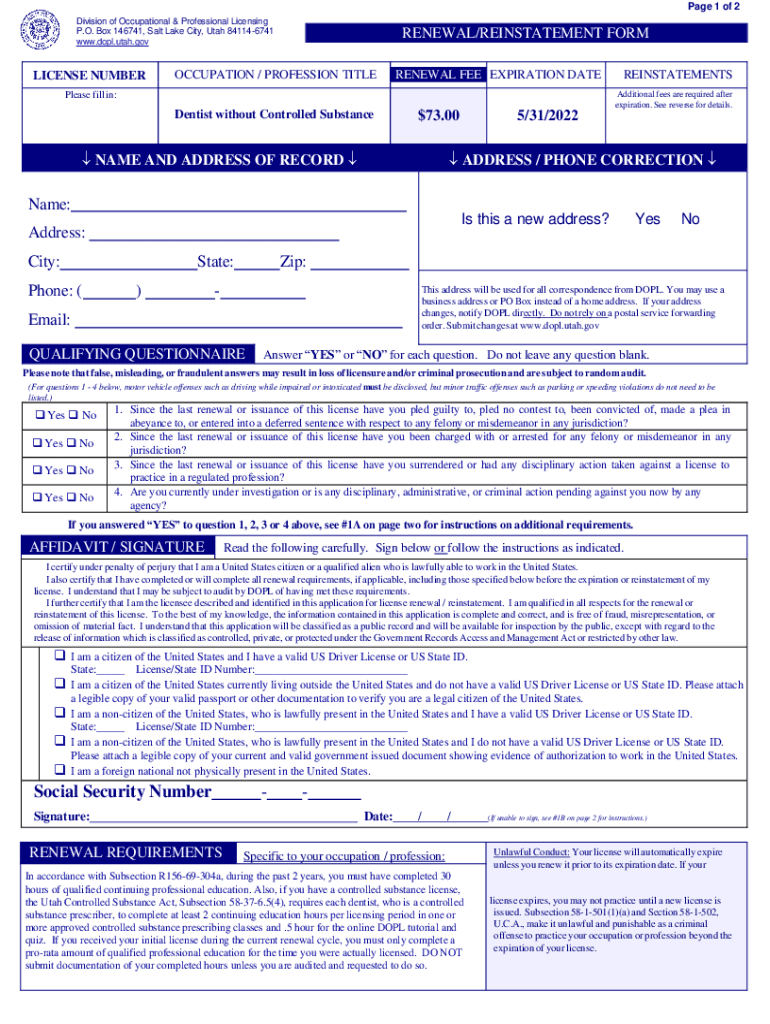 Page 1 of 2 Division of Occupational & Professional Licensing P.O. Box 146741, Salt Lake City, Utah 841146741 www.dopl.utah.govLICENSE NUMBERRENEWAL/REINSTATEMENT PREOCCUPATION / PROFESSION TITLERENEWAL