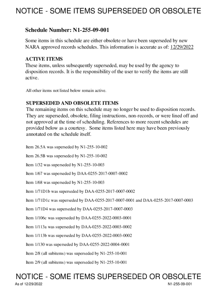 NOTICE SOME ITEMS SUPERSEDED OR OBSOLETE Schedule Number: N125509001 Some items in this schedule are either obsolete or have been superseded by new NARA approved records schedules. This information