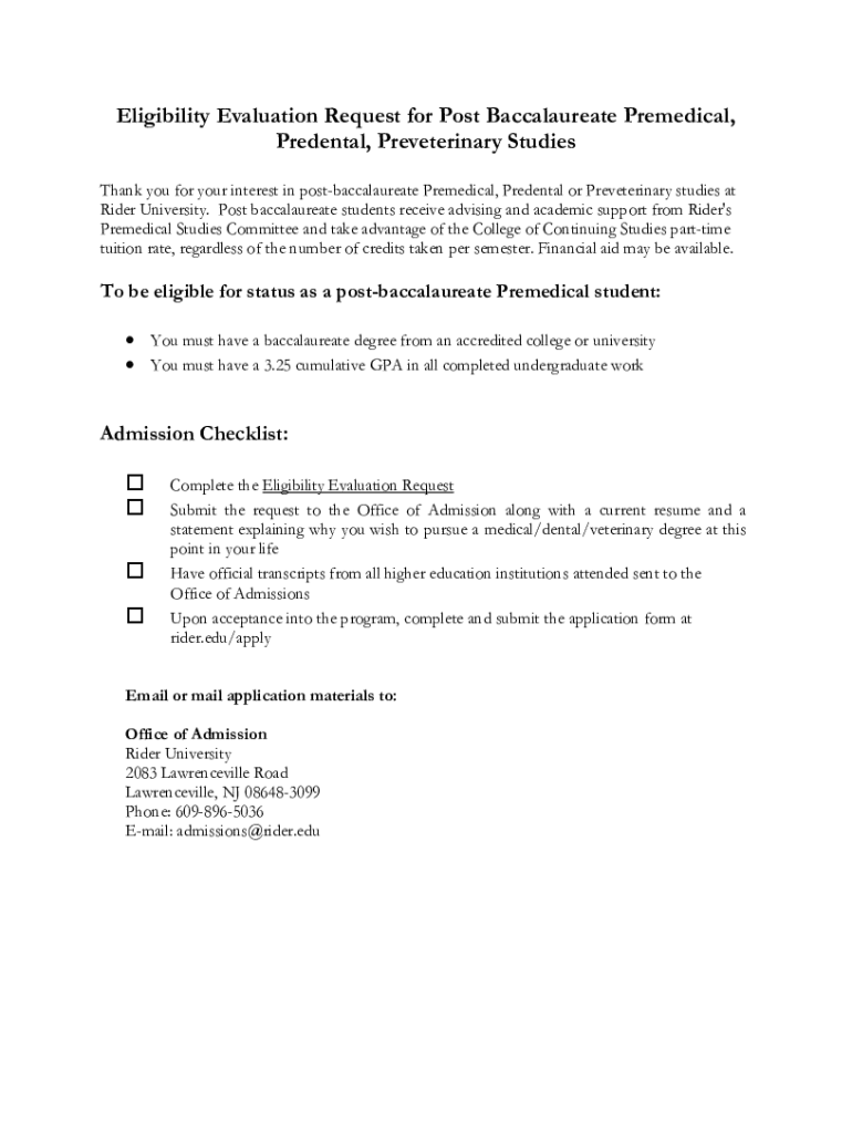 Eligibility Evaluation Request for Post Baccalaureate Premedical, Pedestal, Pre-veterinary Studies Thank you for your interest in postbaccalaureate Premedical, Pedestal or Pre-veterinary studies at