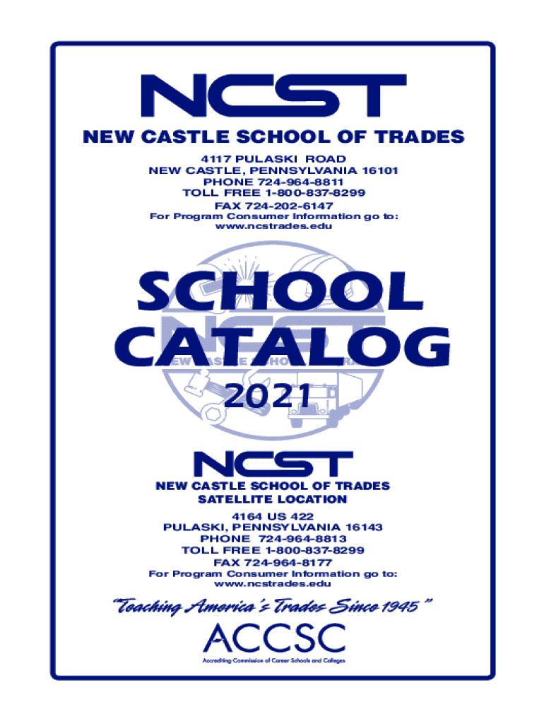 NEW CASTLE SCHOOL OF TRADES 4117 PULASKI ROAD NEW CASTLE, PENNSYLVANIA 16101 PHONE 7249648811 TOLL FREE 18008378299 FAX 7242026147 For Program Consumer Information go to: www.ncstrades.eduSCHOOL CATALOG