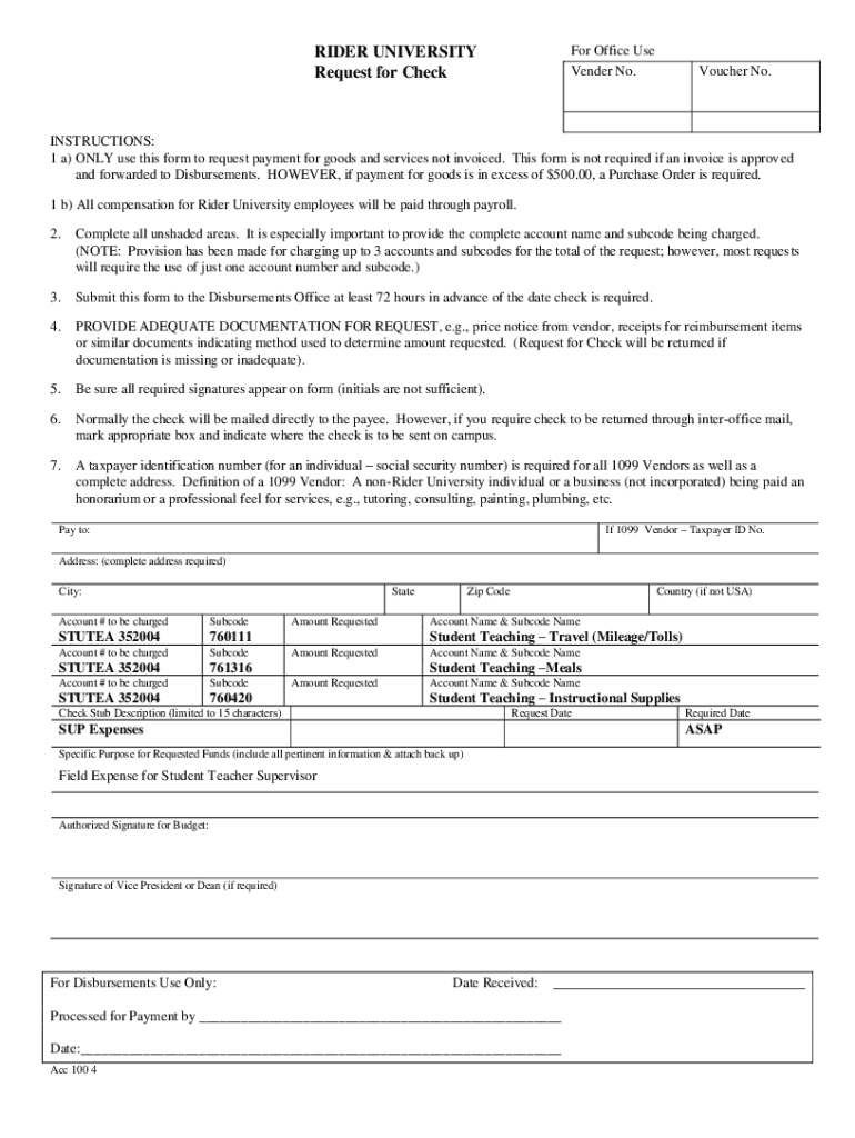 For Office Use Gender No. RIDER UNIVERSITY Request for CheckVoucher No.INSTRUCTIONS: 1 a) ONLY use this form to request payment for goods and services not invoiced. This form is not required if an