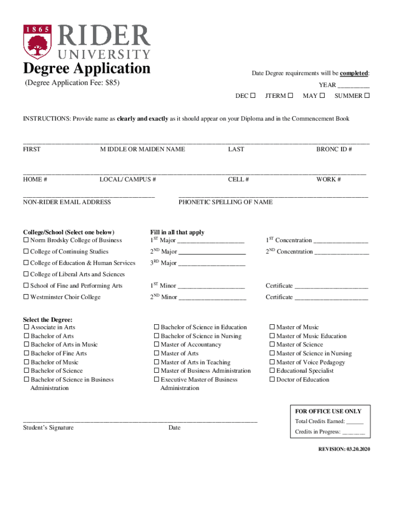 Degree ApplicationDate Degree requirements will be completed:(Degree Application Fee: $85)YEAR ___ DEC TERM MAY SUMMER INSTRUCTIONS: Provide name as clearly and exactly as it should appear on your