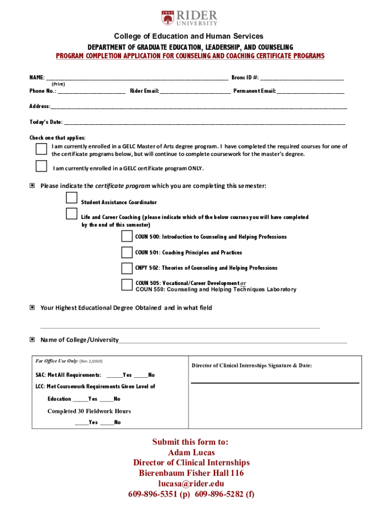 PROGRAM COMPLETION APPLICATION FOR COUNSELING AND COACHING CERTIFICATE PROGRAMS