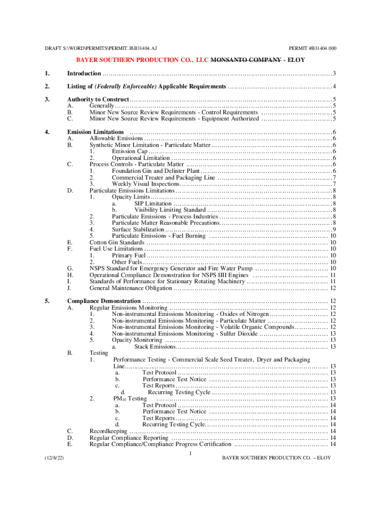 DRAFT S:WORDPERMITSPERMIT.BB31404.PERMIT #B31404.000BAYER SOUTHERN PRODUCTION CO., LLC MONSANTO COMPANY ELOY 1. Introduction ..............................................................................................................