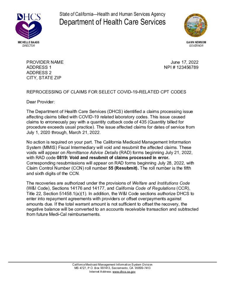 State of CaliforniaHealth and Human Services AgencyDepartment of Health Care Services MICHELLE BASS DIRECTORGAVIN NEWSOM GOVERNORPROVIDER NAME ADDRESS 1 ADDRESS 2 CITY, STATE ZIP June 17, 2022, NPI