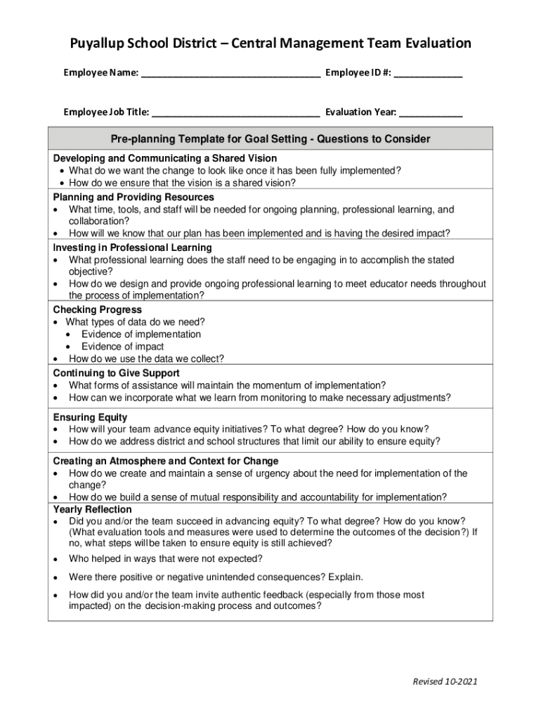 Puyallup School District Central Management Team Evaluation Employee Name: ___ Employee ID #: ___Employee Job Title: ___ Evaluation Year: ___ Preplanning Template for Goal Setting Questions to Consider