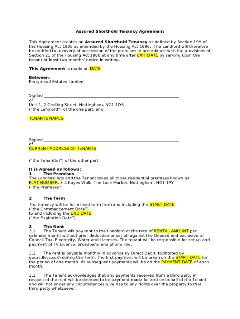 ASSURED SHORTHOLD TENANCY Sample Clauses template instructions